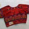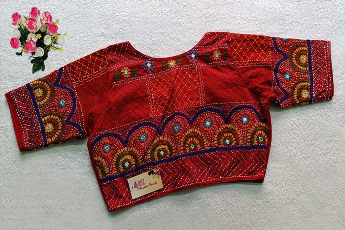 This is a Red Multi Color Hand Embroidered Lambani Blouse. This Blouse is Curved V-Neckline in Frontside & Boat Neckline in Backside. This is a Princess Cut, Non-Padded, Glass Sleeve Blouse with Front Open. You can team it up with any contrast-colored Traditional/Printed Saree.