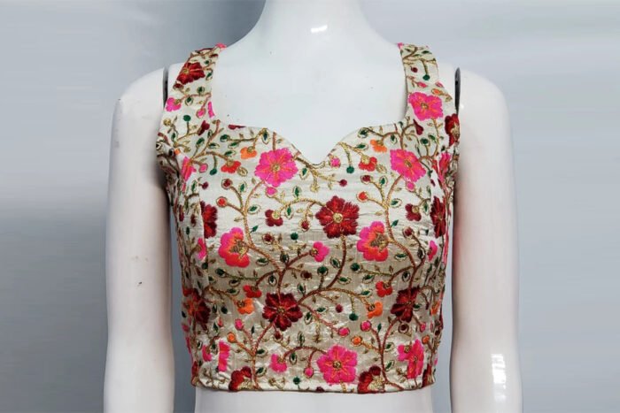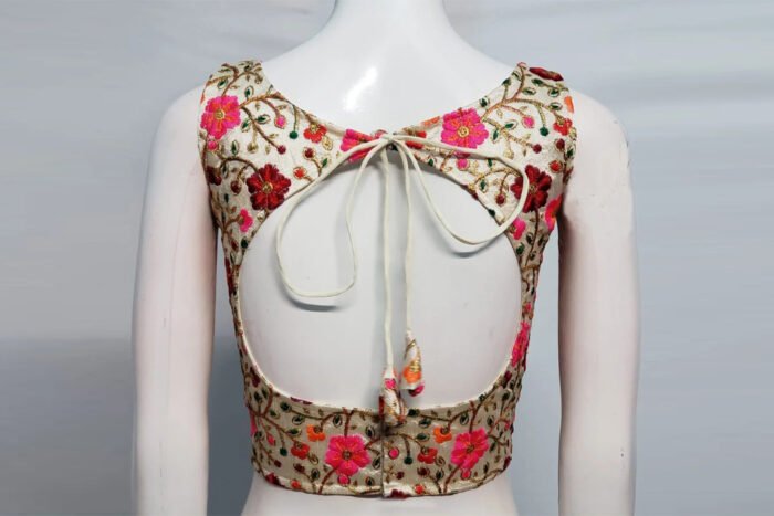 This is an Off- White Multi Color Raw Silk Blouse. This Blouse is Sweetheart Neckline in Frontside and Keyhole Neckline in Backside with Tie Up. This is a Princess Cut, Padded & Sleeveless Blouse with Back Open. You can team it up with any contrast colored Printed or Traditional Saree.
