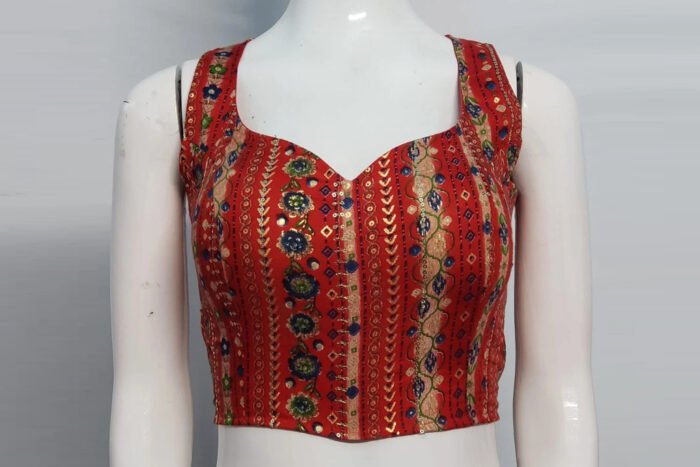 This is a Red Multi Color Rayon Blouse. This Blouse is Sweetheart Neckline in Frontside and Keyhole Neckline in Backside. This is a Princess Cut, Padded & Sleeveless Blouse with Back Open. You can team it up with any contrast colored Printed or Traditional Saree.