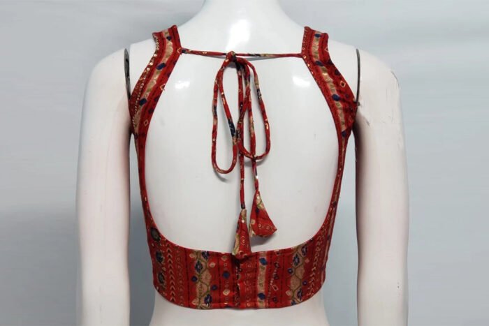 This is a Red Multi Color Rayon Blouse. This Blouse is Sweetheart Neckline in Frontside and U-Neckline in Backside with Tie Up. This is a Princess Cut, Padded & Sleeveless Blouse with Back Open. You can team it up with any contrast colored Printed or Traditional Saree.