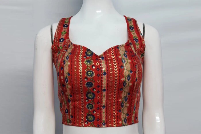 This is a Red Multi Color Rayon Blouse. This Blouse is Sweetheart Neckline in Frontside and Curved U-Neckline in Backside with Tie Up. This is a Princess Cut, Padded & Sleeveless Blouse with Back Open. You can team it up with any contrast colored Printed or Traditional Saree.