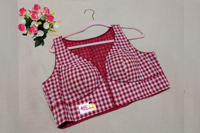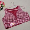 This is a Red & White Color Cotton Gamcha Printed Blouse. It is Deep Sweetheart Neckline in Frontside and Boat Neckline with Applique Work in Backside. This is a Princess Cut, Padded, Sleeveless Blouse with Back Open. You can team it up with any contrast colored Printed/Traditional Saree.
