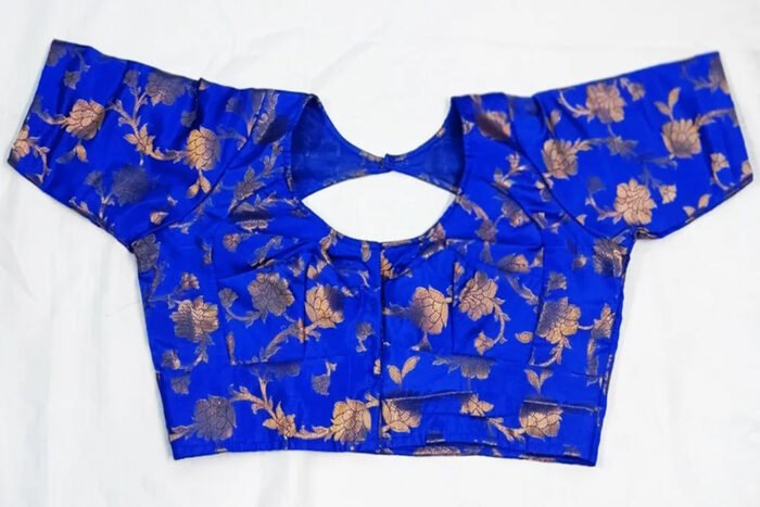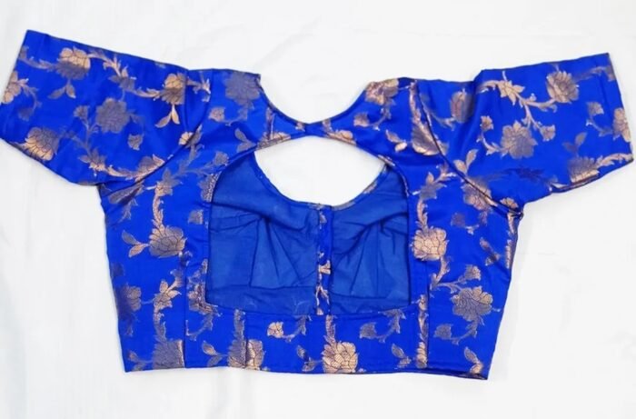 This is a Royal Blue Color Brocade Benarasi Blouse. This Blouse is V-Neckline in Frontside & Key-Hole Neckline in Backside. This is a Choli Cut (Used Sponge), Non-Padded, Glass Sleeve Blouse with Front Open. You can team it up with any contrast-colored Traditional/Fancy Saree.