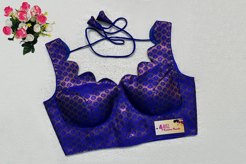 This is a Royal Blue Color Brocade Blouse. This is a Scallop Neckline Blouse in both Frontside & Backside with Tie-Up. This is a Princess Cut, Padded, Sleeveless Blouse with Back Open. You can team it up with any contrast-colored Traditional/Printed Saree.