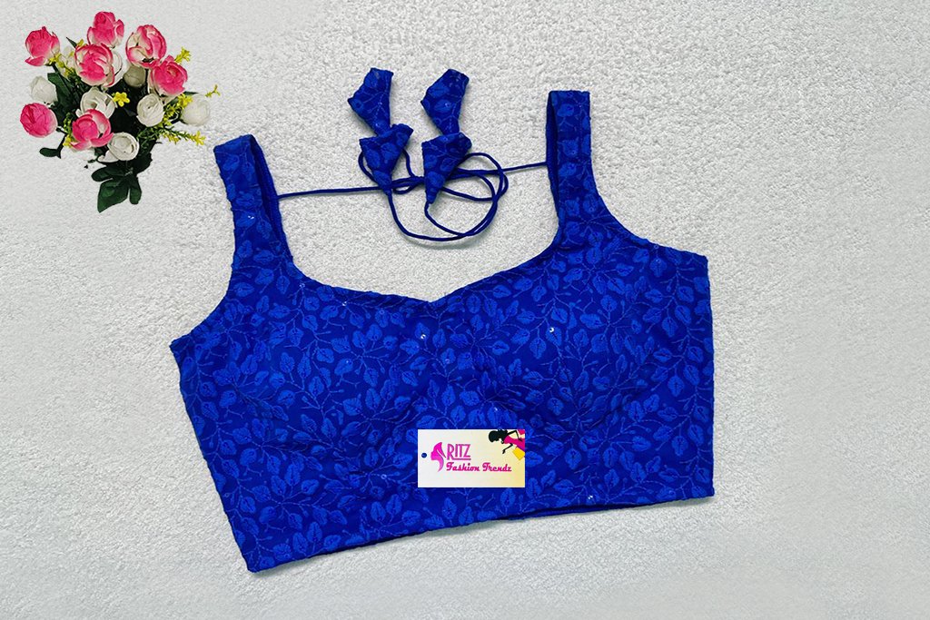 This is a Royal Blue Color Georgette Chikan Kari Blouse. This is a Sweetheart Neckline Blouse in Frontside & U-Neckline in Backside with Tie-Up. This is a Princess Cut, Padded, Sleeveless Blouse with Back Open. You can team it up with any contrast-colored Traditional/Printed Saree.