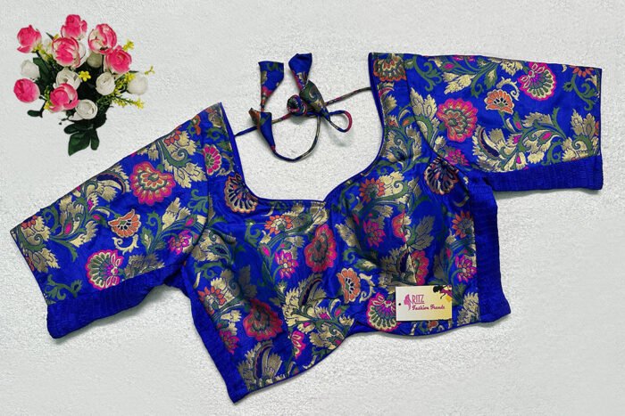 This is a Royal Blue Color Meena Kari Brocade Elastic Ease Blouse. This is Sweetheart Neckline in Frontside & U-Neckline in Backside with Tie-Up. This is a Princess Cut, Padded, Glass Sleeve Blouse with Back Open. You can team it up with any contrast-colored Traditional/Printed Saree.