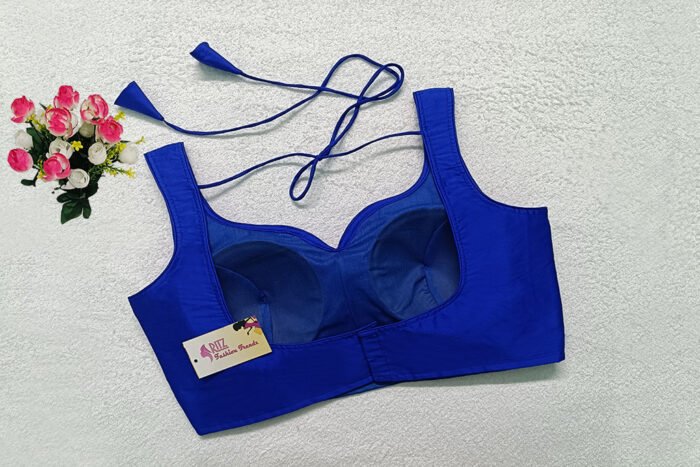 This is a Royal Blue Color Samo Silk Blouse. This Blouse is Sweetheart Neckline in Frontside & U-Neckline in Backside with Tie-Up. This is a Princess Cut, Padded, Sleeveless Blouse with Back Open. You can team it up with any contrast-colored Traditional/Printed Saree.