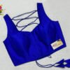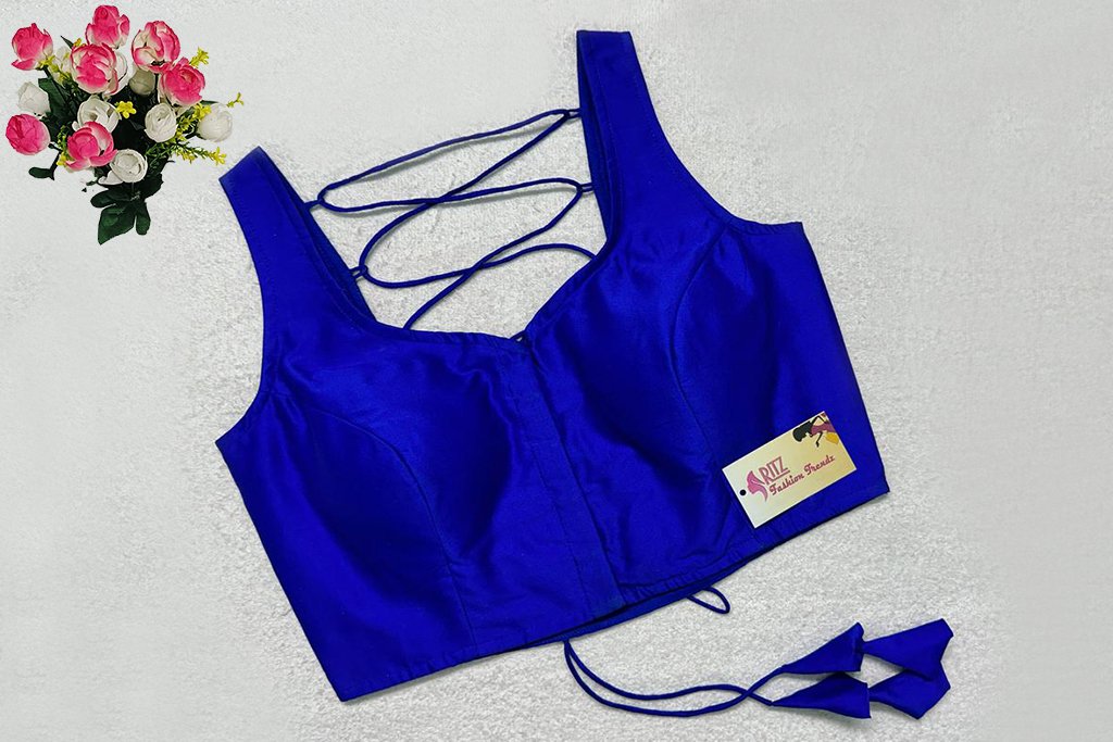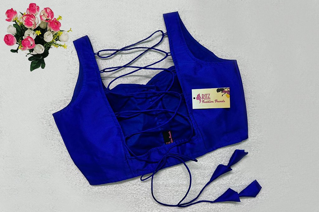 This is a Royal Blue Samo Silk Blouse. This is a Sweetheart Neckline Blouse in Frontside & Criss-Cross Neckline in Backside with Tie-Up. This is a Princess Cut, Padded, Sleeveless Blouse with Back Open. You can team it up with any contrast-colored Traditional/Printed Saree.