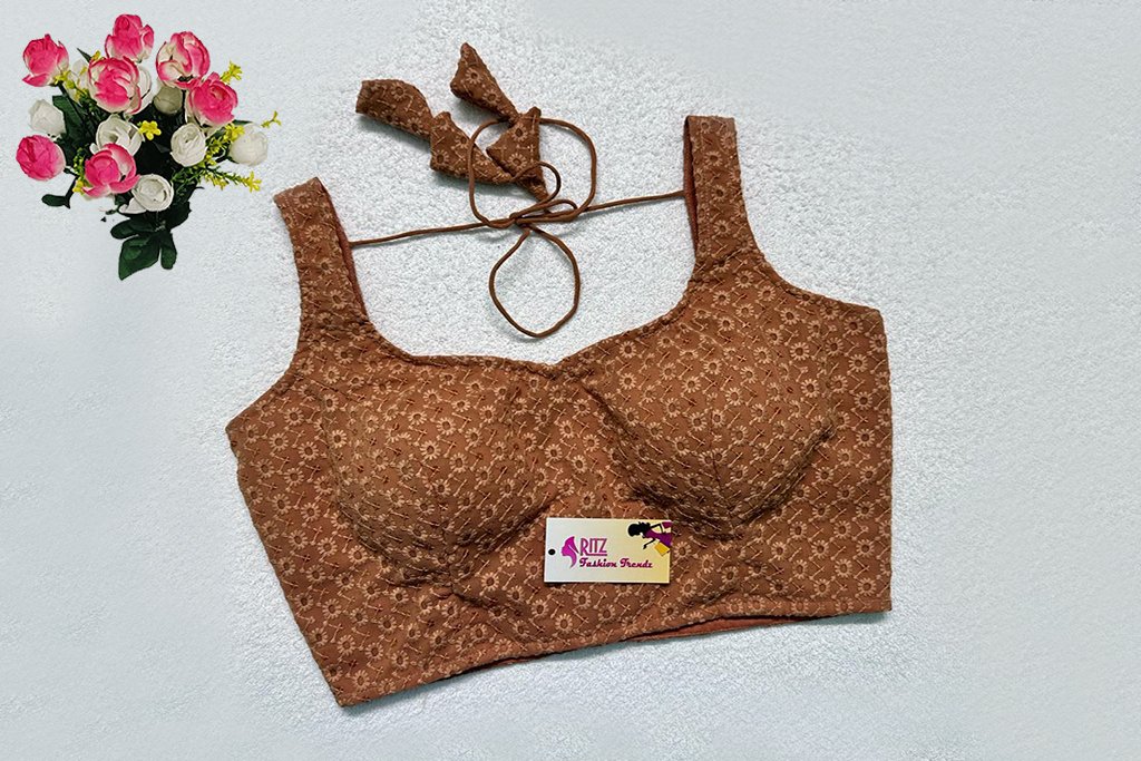 This is a Sandal Color Georgette Chikan Kari Blouse. This is a Sweetheart Neckline Blouse in Frontside & U-Neckline in Backside with Tie-Up. This is a Princess Cut, Padded, Sleeveless Blouse with Back Open. You can team it up with any contrast-colored Traditional/Printed Saree.