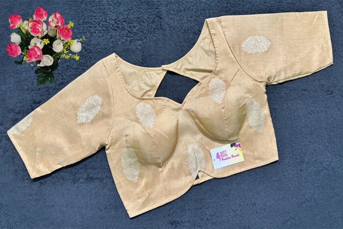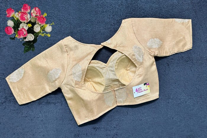 This is a Sandal Color Russian Silk Blouse. This is Sweetheart Neckline in Frontside & Key-Hole Neckline in Backside. This is a Princess Cut, Padded, Glass Sleeve Blouse with Back Open. You can team it up with any contrast-colored Traditional/Printed Saree.