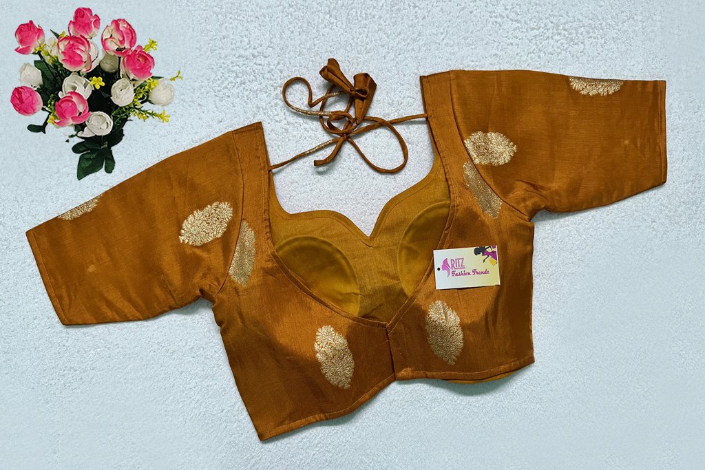 This is a Mustard Color Russian Silk Blouse. This is Sweetheart Neckline in Frontside & Leaf Neckline in Backside with Tie-Up. This is a Princess Cut, Padded, Glass Sleeve Blouse with Back Open. You can team it up with any contrast-colored Traditional/Printed Saree.