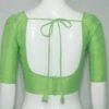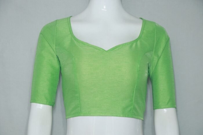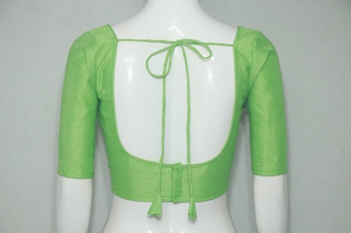 This is a Pastel Green Color Raw Silk Blouse. This Blouse is Leaf Neckline Frontside and U-Neckline in Backside with Tie-Up. This is a Princess Cut Padded Blouse With Plain Motif. This Blouse is Glass Sleeve and Back Open. You Can Team it up with any contrast color Traditional Saree. We assure the authenticity and quality of our products.