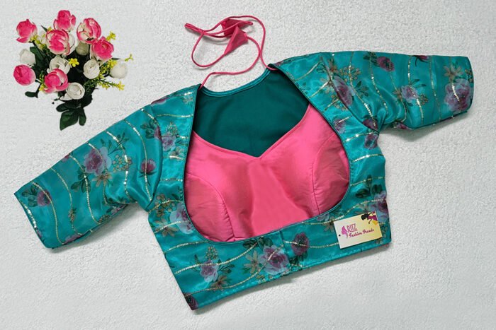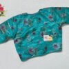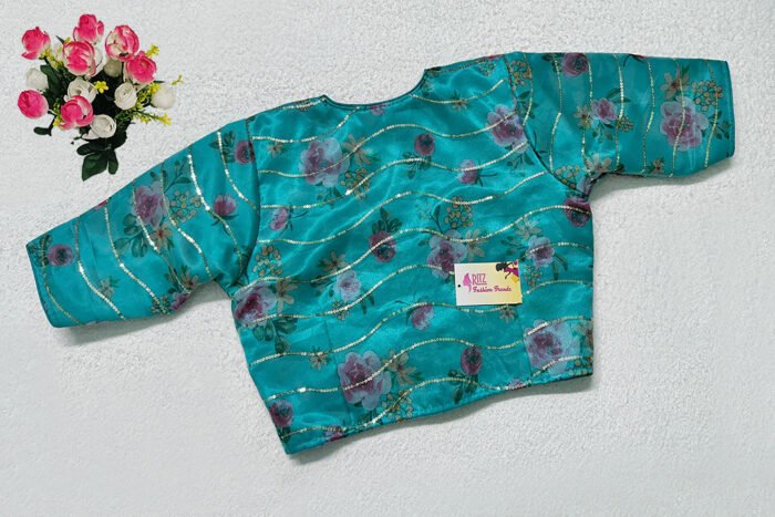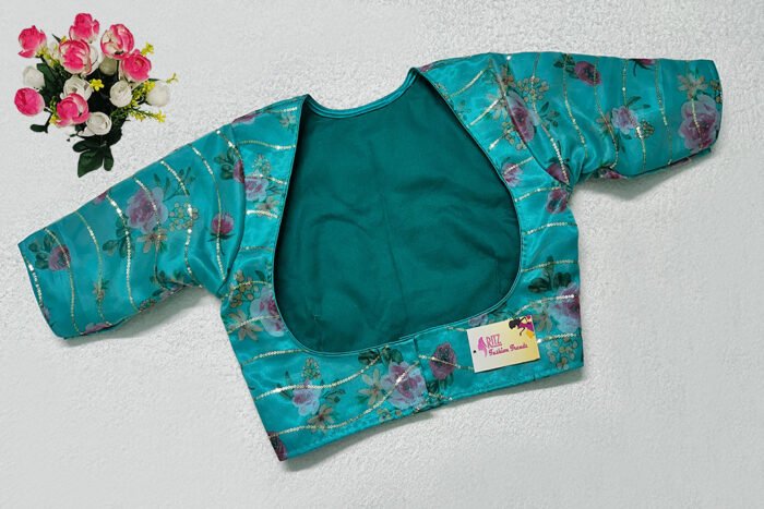 This is a Sea Green Multi Color Samo Silk With Organza Jacket Blouse. This is Leaf Neckline in Frontside & Boat Neckline in Backside with Tie-Up. This is a Princess Cut, Padded, Glass Sleeve Jacket Blouse with Front Open. You can team it up with any contrast-colored Traditional/Printed Saree.