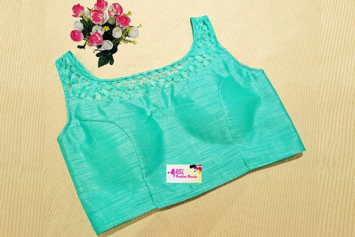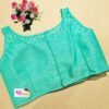 This is a Sea Green Color Raw Silk Blouse. It is Illusion Neckline in both Frontside and Backside. This is a Princess Cut, Padded, Sleeveless Blouse with Back Open. You can team it up with any contrast colored Printed/Traditional Saree.
