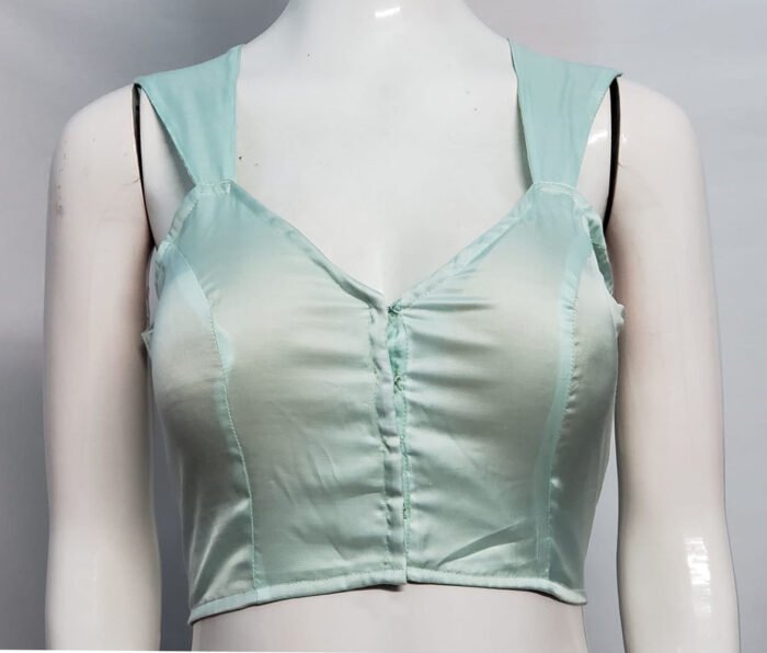 This is a Powder Blue Color Malai Cotton Blouse. This Blouse is V-Neckline in Frontside and U-Neckline in Backside. This is a Princess Cut, Padded & Sleeveless Blouse with Front Open. You can team it up with any contrast colored Printed or Traditional Saree.