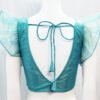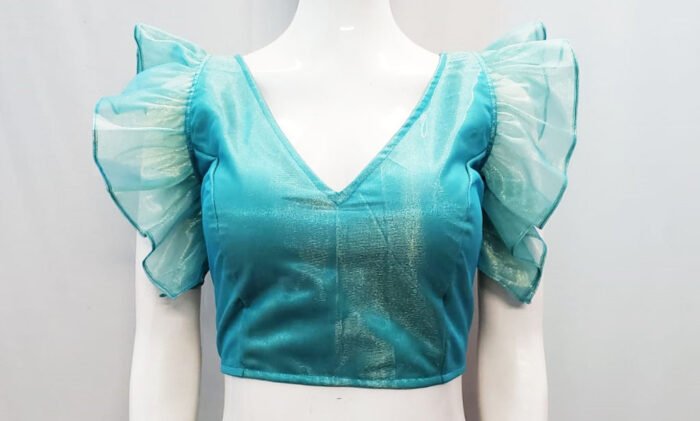 This is a Blue Color Tissue Blouse. This Blouse is V- Neckline in Frontside & Backside with Tie-Up. This is a Princess Cut, Padded Blouse. This Blouse is Ruffle Sleeve and Back Open. You can team it up with any contrast-colored Traditional/Fancy Saree.