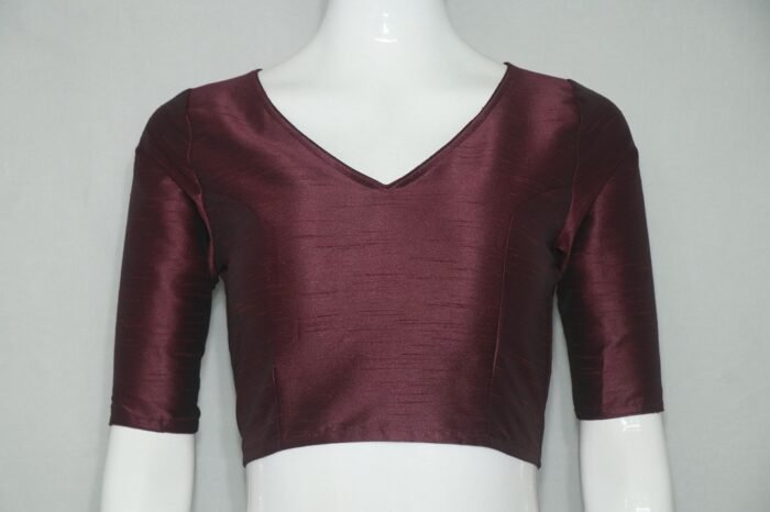 This is a Wine Color Raw Silk Blouse With Plain Motif. It has V-Neckline in both Frontside and Backside with Tie-Up. This is a Princess Cut Padded Glass Sleeve Blouse with Back Open. A Very Stylish Saree Blouse Made With Poly Silk Fabric Which Has A Slight Rich Shine. The Print Is Very Modern And This Blouse Is Lined With Pure Cotton For Extra Comfort. We assure the authenticity and quality of our products.
