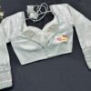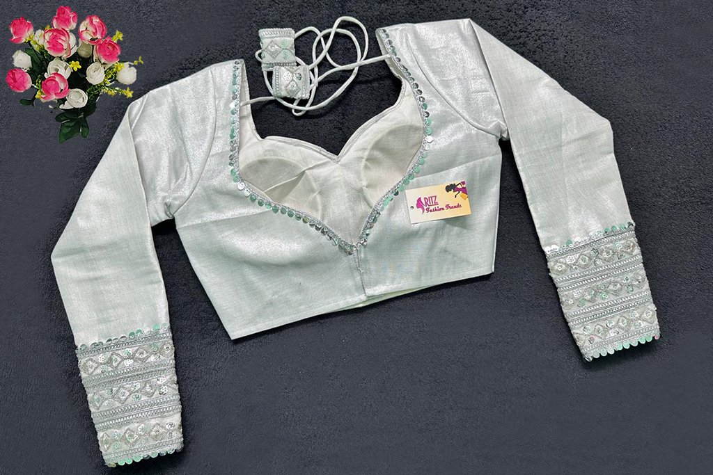 This is a Silver Color Brocade Blouse. This is a Sweetheart Neckline Blouse in both Frontside & Backside with Tie-Up. This is a Princess Cut, Padded, Full Sleeve Blouse with Back Open. You can team it up with any contrast-colored Traditional/Printed Saree.