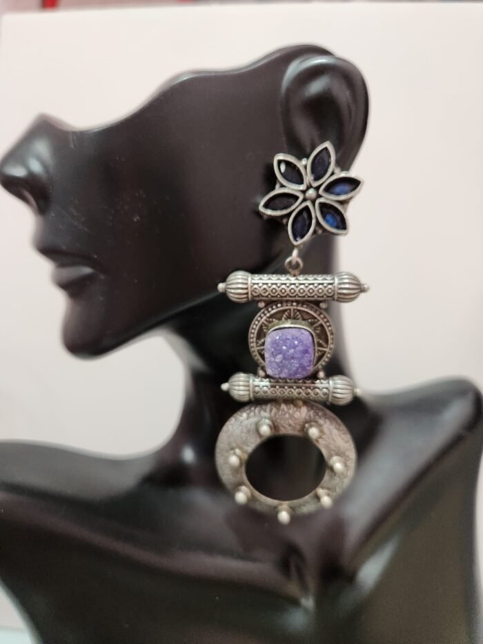Silver Replica Layered Ear-Ring with Blue Stones. This Trendy Earring will look Wonderful with Fancy Saree. You can wear this Beaded Earring Easily.