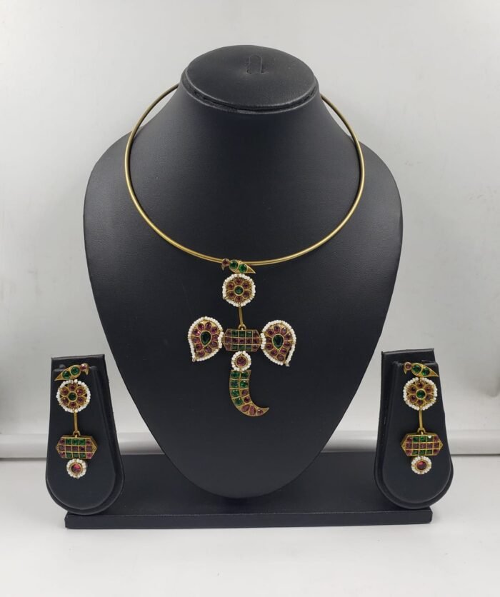 Silver Replica Rajwadi Polish Necklace Set with Green & Rubi Monalisa Stone With Pearl.