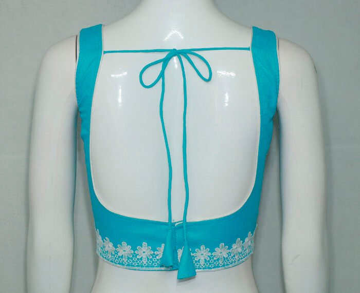 This is a Sky Blue Color Khadi Cotton Blouse with Lace in Waist. This is a Sweet Heart Neckline in Frontside and U-Neckline in Backside with Tie Up. This is a Princess Cut, Padded, Sleeveless Blouse with Back Open. You can team it up with any contrast colored Printed or Traditional Saree.