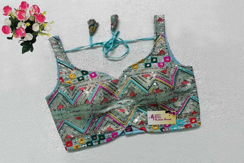 This is a Sky Blue Multi Color Georgette Embroidered Blouse. This is Sweetheart Neckline in Frontside & Leaf Neckline in Backside with Tie-Up. This is a Princess Cut, Padded, Sleeveless Blouse with Back Open. You can team it up with any contrast-colored Traditional/Printed Saree.