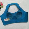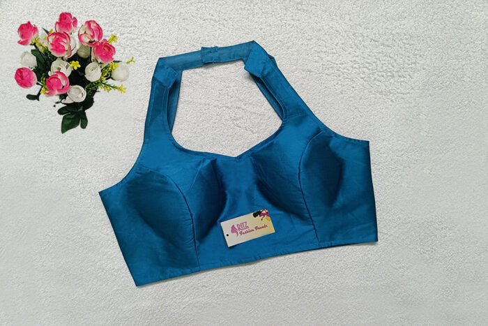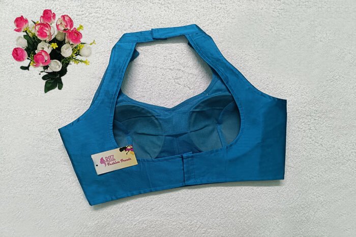 This is a Turquoise Blue Color Samo Silk Blouse. This Blouse is Double Strap Halter Neckline in both Frontside & Backside. This is a Princess Cut, Padded, Sleeveless Blouse with Back Open. You can team it up with any contrast-colored Traditional/Printed Saree.