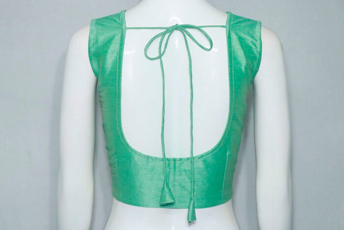 This is a Sea Green Color Raw Silk Blouse. This Blouse is V Neckline in Front and U Neckline in Backside with Tie Up. This is a Non-Padded Choli Cut Sponge Blouse. This Blouse is Sleeveless and Front Open. You can team it up with any contrast color Printed or Traditional Saree.