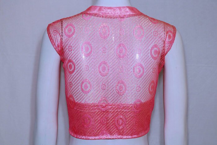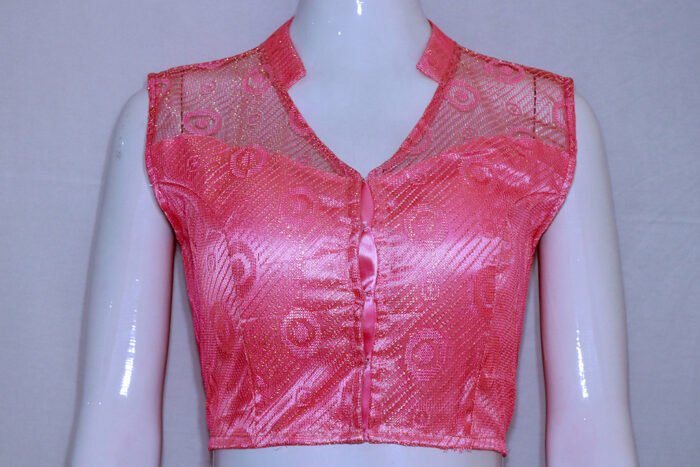 This is a Pink Color Embroidered Net Blouse. It is High Neckline in Frontside and Backside with Mandarin Collar. It is Princess cut and Padded Blouse. This Blouse is Sleeveless and Front Open. You can team it up with any contrast color Traditional or Printed Saree.