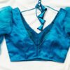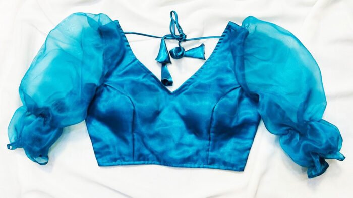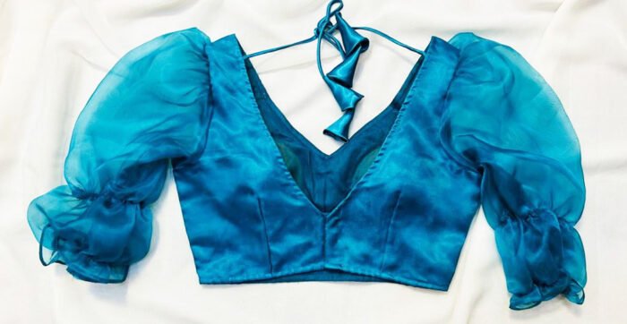 This is a Turquiose Blue Color Organza Blouse. This Blouse is V-Neckline in Frontside & Backside with Tie-Up. This is a Princess Cut, Padded Blouse. This Blouse is Puffy Sleeves and Back Open. You can team it up with any contrast-colored Traditional/Fancy Saree.