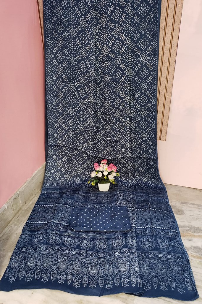 Turquoise Blue Color Ajrakh Printed Modal Silk Saree.