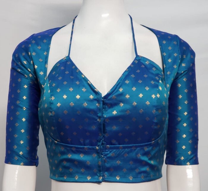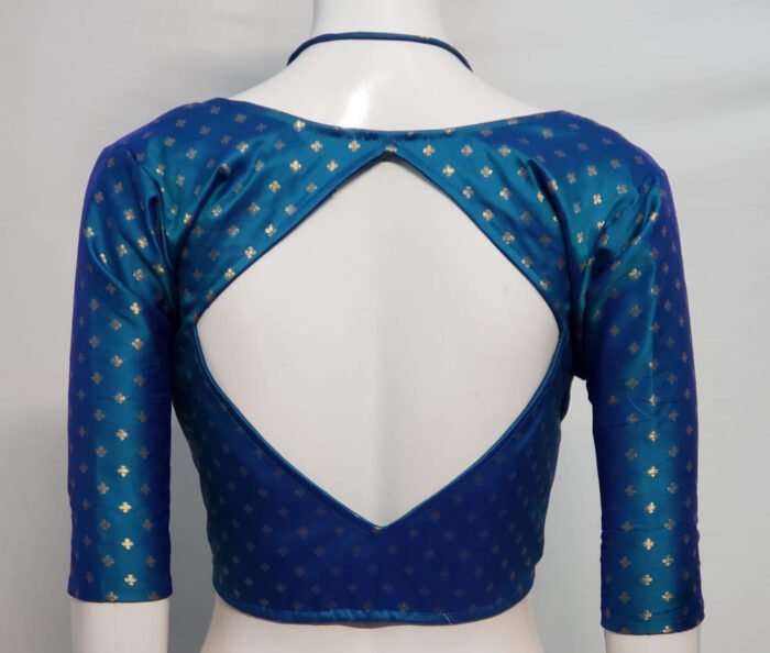 This is a Blue Color Brocade Blouse. This Blouse is V-Neckline in Frontside and High-Neckline in Backside. This is a Princess Cut, Padded & Glass Sleeve Blouse with Front Open & Spaghetti Strap. You can team it up with any contrast colored Printed or Traditional Saree.
