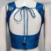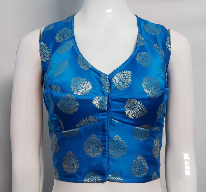 This is a Blue Color Satin Benarasi Blouse. This Blouse is Leaf Neckline in Frontside and U-Neckline in Backside with Tie-Up. This is a Choli-Cut, Non-Padded, (Used Sponge) Sleeveless Blouse with Front open. You can team it up with any contrast colored Printed or Traditional Saree.