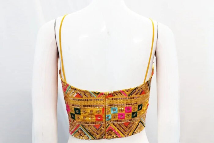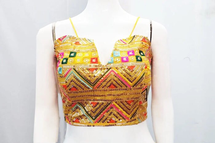 This is a Yellow Multi Color Heavy Embroidered Georgette. This Blouse is U-Neckline in Frontside & Band Neckline in Backside. This is a Princess Cut, Padded Blouse. This Blouse is Spaghetti Sleeve and Back Open. You can team it up with any contrast-color Traditional/Fancy Saree.
