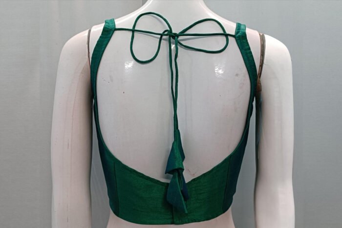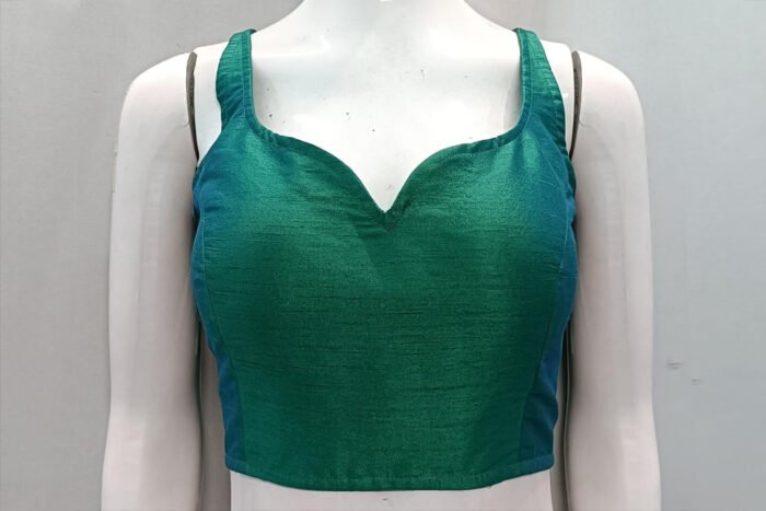 This is an Emerald Green Dual Tone Raw Silk Blouse. This Blouse is Sweetheart Neckline in Frontside and Leaf Neckline in Backside with Tie-Up. This is a Princess Cut, Padded, Sleeveless Blouse with Back Open. You can team it up with any contrast colored Printed or Traditional Saree.