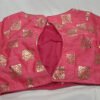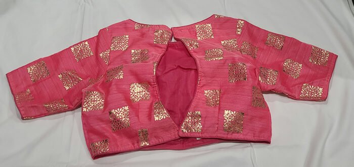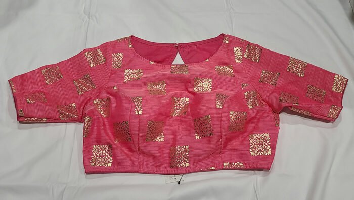 This is a Pink Color Silk with Golden Color Rubber Printed Blouse. It is Round High Neckline in Frontside and Backside with Keyhole Neckline. This is a Princess Cut Padded Blouse. This Blouse is Glass Sleeve and Back Open. You can team it up with any contrast colored Traditional or Printed Saree.