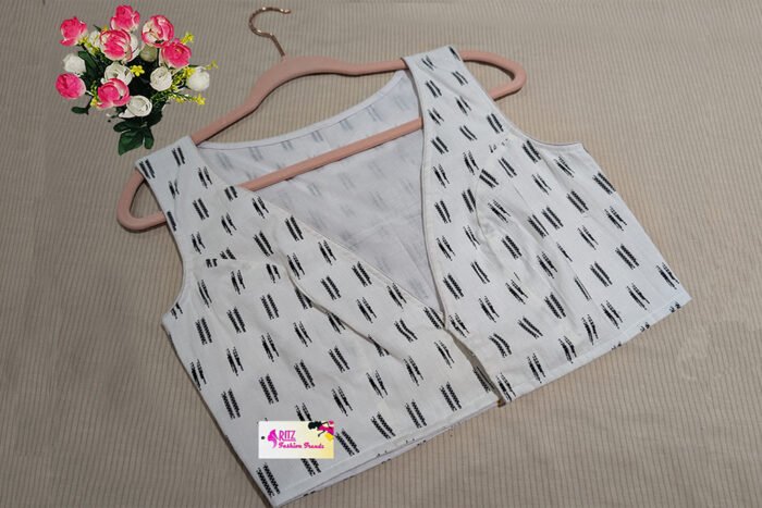 This is a White & Black Color Cotton Printed Blouse. It is V-Neckline in Frontside and Boat Neckline in Backside. This is a Princess Cut, Padded, Sleeveless Blouse with Front Open. You can team it up with any Contrast Colored Saree.