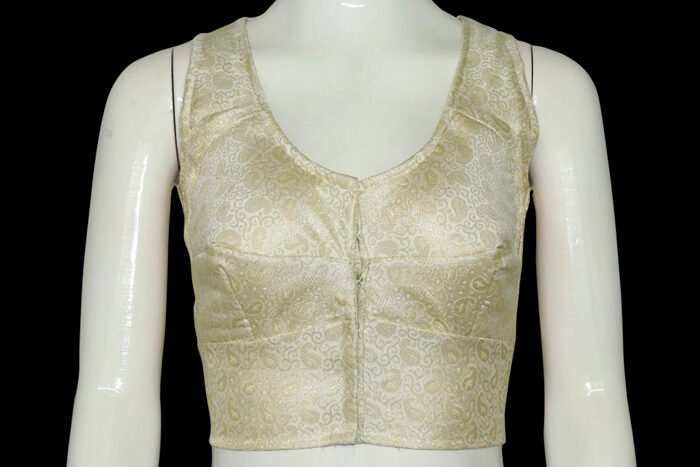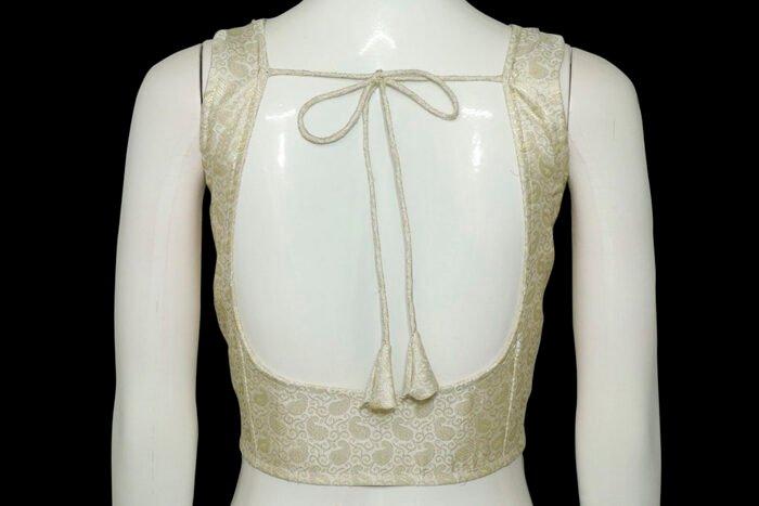 This is an Off-White Color Brocade Benarasi Blouse with Zari Work. This Blouse is U-Neckline in Frontside and Rounded Square Neckline in Backside with Tie-Up. This is a Choli Cut Non-Padded Sponge Blouse with Front Open. This Blouse is Sleeveless. You can team it up with any contrast colored Traditional Saree.