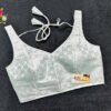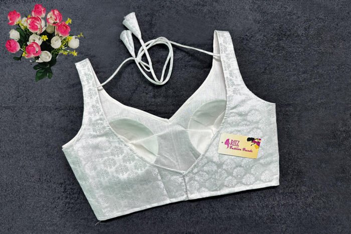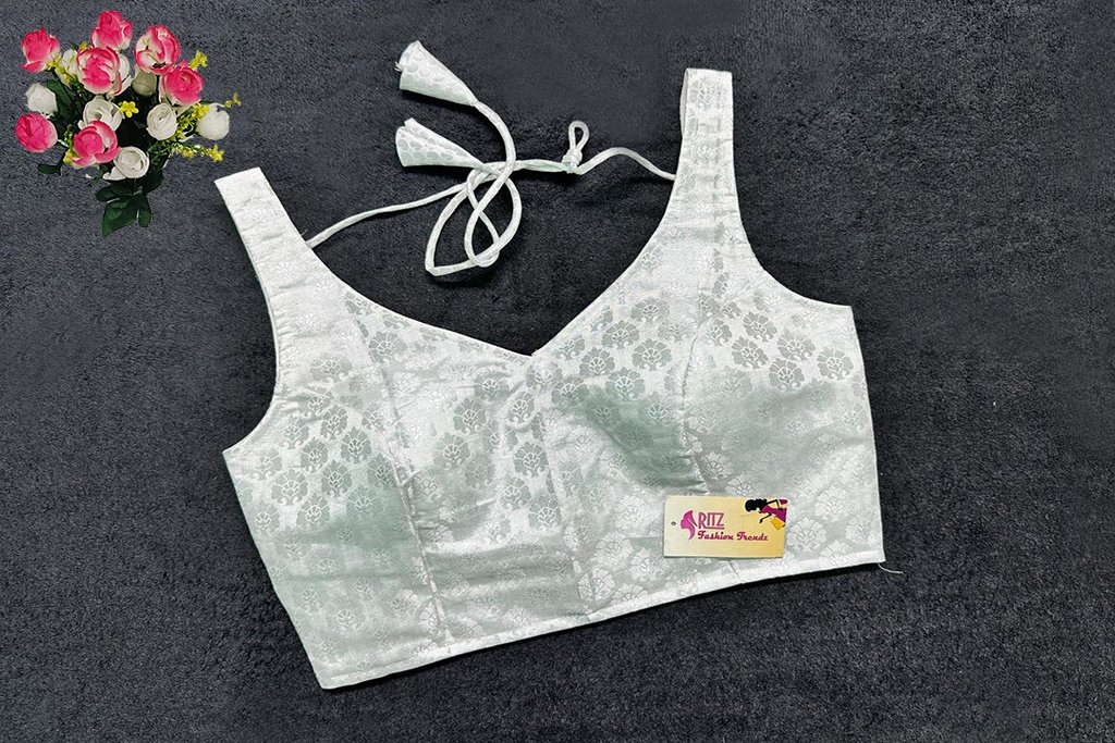 This is a Silver Color Brocade Blouse. This is a Leaf Neckline Blouse in both Frontside & Backside with Tie-Up. This is a Princess Cut, Padded, Sleeveless Blouse with Back Open. You can team it up with any contrast-colored Traditional/Printed Saree.
