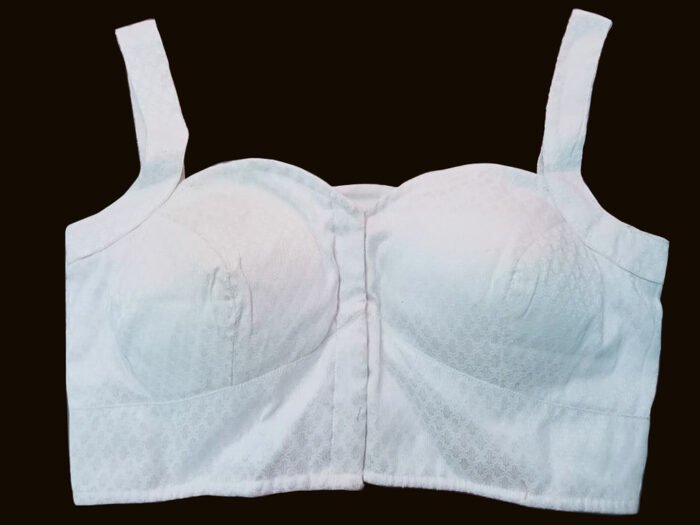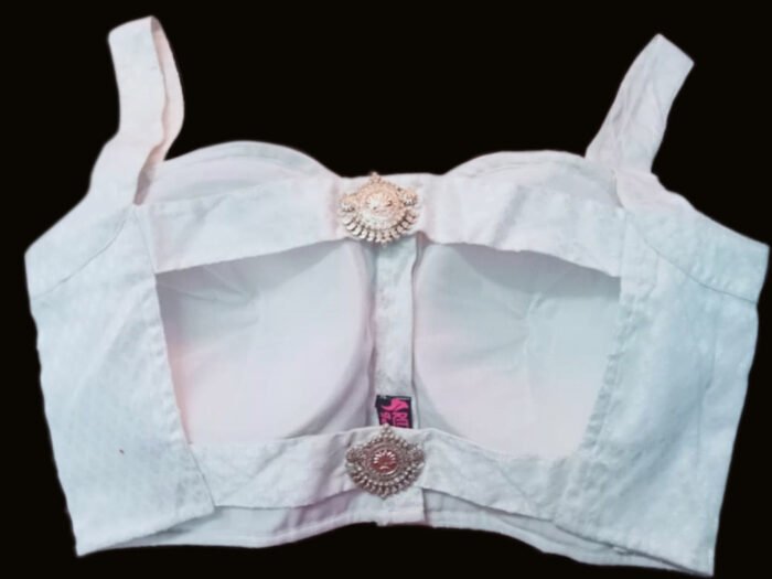 This is a White Color Brocade Blouse. This Blouse has Semi Sweet Heart Neckline in Frontside and Square Neckline in Backside with Brooch. This is a Princess Cut Padded Sleeveless Blouse with Front Open. You can team it up with any contrast colored Traditional Saree.