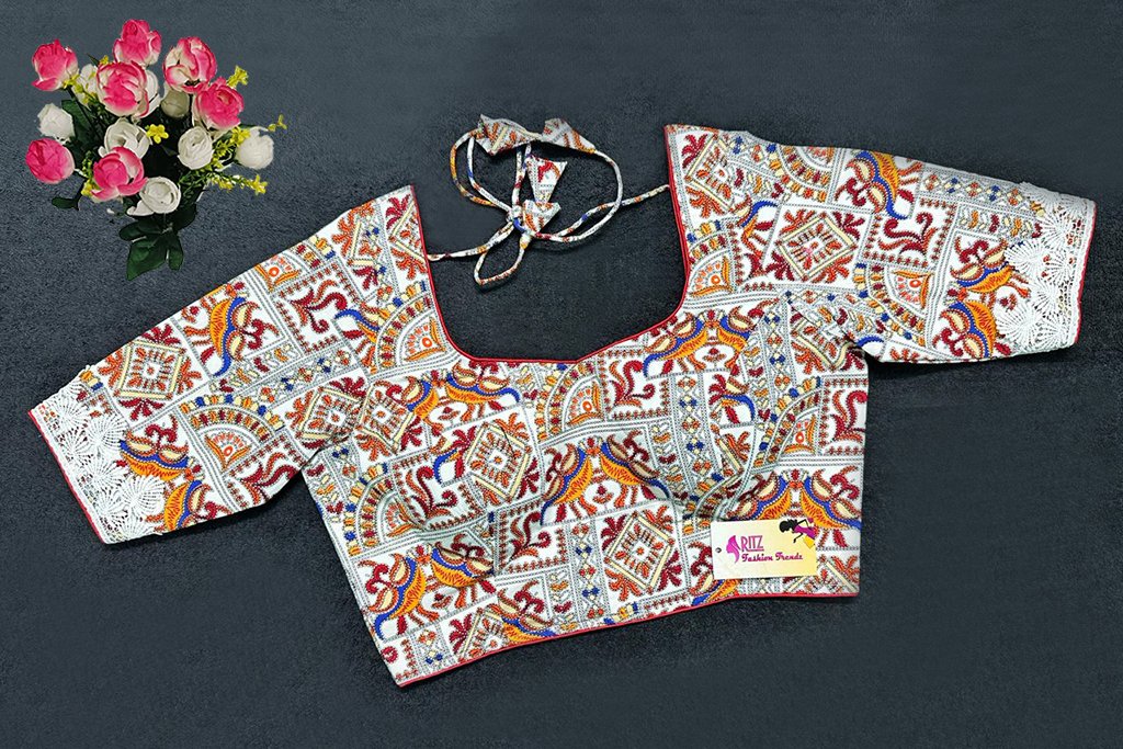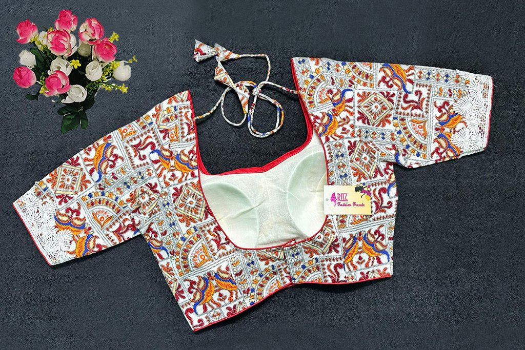 This is a White Multi Color Cotton Printed Blouse. This is a Leaf Neckline Blouse in Frontside & U-Neckline in Backside with Tie-Up. This is a Princess Cut, Padded, Glass Sleeve Blouse with Back Open. You can team it up with any contrast-colored Traditional/Printed Saree.