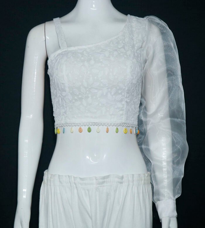 This is a White Color Georgette Chikan Kari Blouse. This Blouse has Semi-Rounded Neckline in both Frontside and Backside with Multicolored Kari Lace Work. This is a Princess Cut Padded Blouse with Back Open. This Blouse has Organza full puffy sleeve in one side and Spaghetti Sleeve on the other side. You can team it up with any contrast colored Traditional Saree.