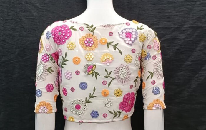 This is a White Multi Color Georgette Heavy Embroidered Blouse. This Blouse is Sweetheart Neckline in Frontside & Boat Neckline in Backside. This is a Princess Cut, Padded, Glass Sleeve Blouse with Front Open. You can team it up with any contrast-colored Traditional/Fancy Saree.