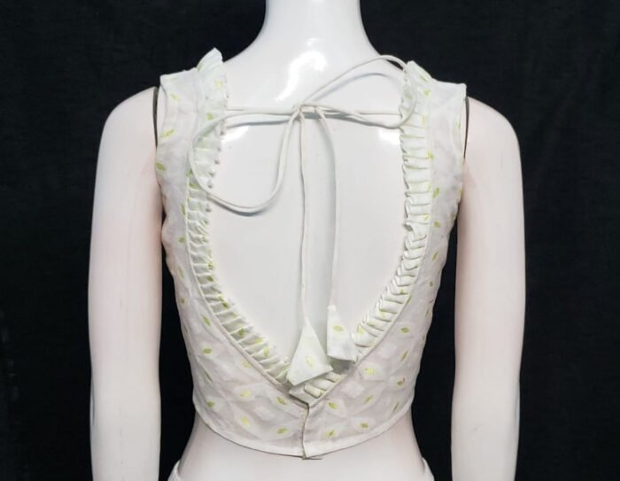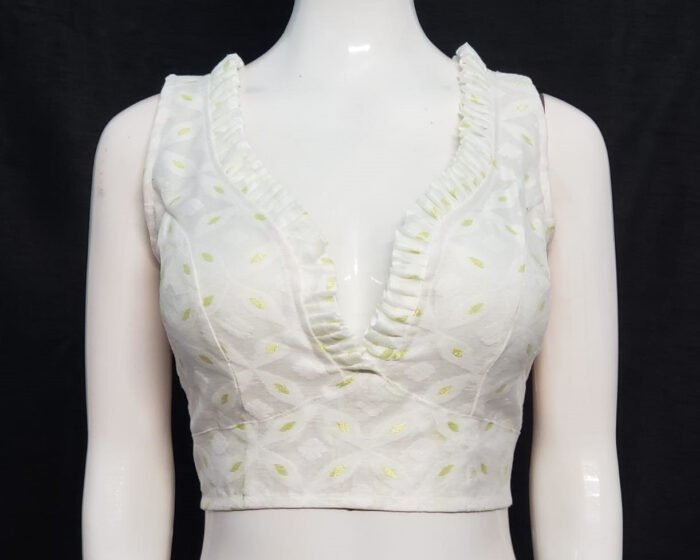 This is a White Color Jamdani Blouse. This is Sweet Heart Neckline in Frontside and Leaf Neckline in Backside with Tie-Up. This is a Princess Cut Padded Sleeveless Blouse with Back Open. You can team it up with any contrast colored Printed or Traditional Saree.
