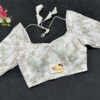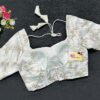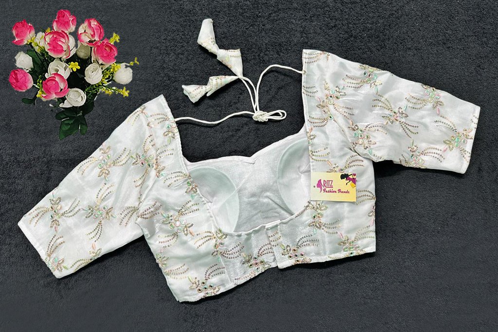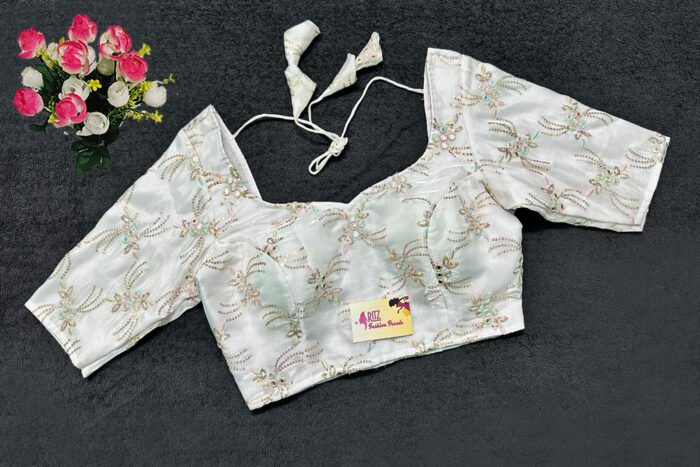 This is a White Color Jimmy Choo Embroidered Blouse. This is Sweetheart Neckline in Frontside & U-Neckline in Backside with Tie-Up. This is a Princess Cut, Padded, Glass Sleeve Blouse with Back Open. You can team it up with any contrast-colored Traditional/Printed Saree.