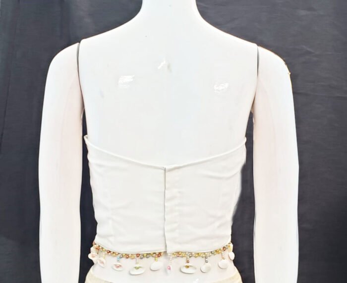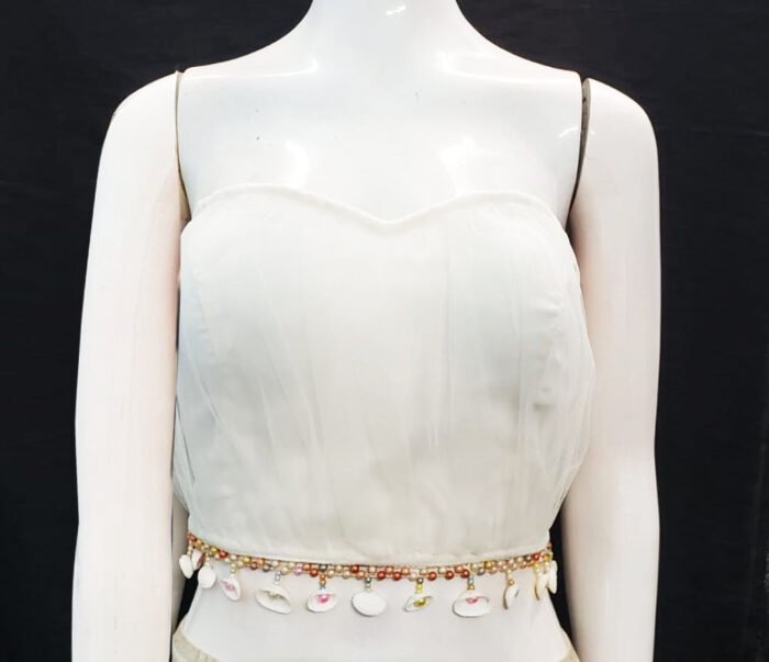 This is a White Color Net Blouse with Kari Lace. This Blouse is Sweetheart Neckline in Frontside &  Band Neckline in Backside . This is a Princess Cut, Padded Blouse. This Blouse is Strapless and Back Open. You can team it up with any contrast-color Traditional/Fancy Saree.