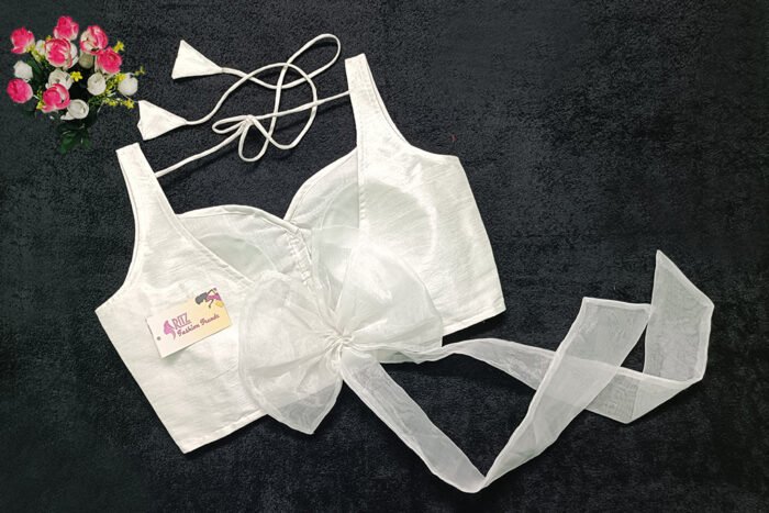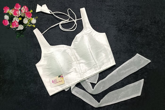 This is a White Color Raw Silk Blouse with Organza Band. This Blouse is Sweetheart Neckline in Frontside & U-Neckline in Backside with a Band. This is a Princess Cut, Padded, Sleeveless Blouse with Front Open. You can team it up with any contrast-colored Traditional/Printed Saree.