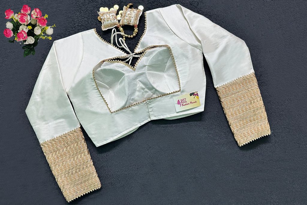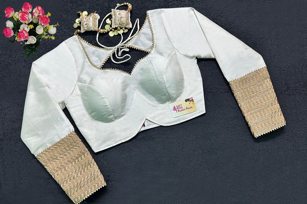 This is a White Color Samo Silk Blouse with Zari Lace. This is a Sweetheart Neckline Blouse in Frontside & Key-hole Neckline in Backside with Tie-Up. This is a Princess Cut, Padded, Full Sleeve Blouse with Back Open. You can team it up with any contrast-colored Traditional/Printed Saree.