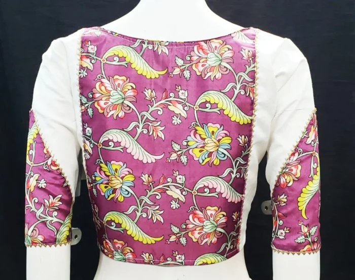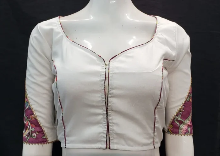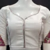 This is a White Multi Color Litchi Silk with Rayon Blouse. This Blouse is Sweet Heart Neckline in Frontside & Boat Neckline in Backside. This is a Princess Cut, Non-Padded Blouse. This Blouse is Glass Sleeve and Front Open. You can team it up with any contrast-colored Traditional/Fancy Saree.