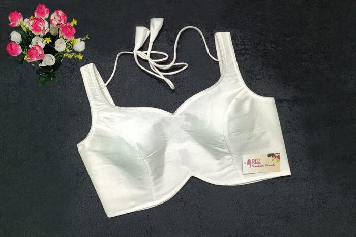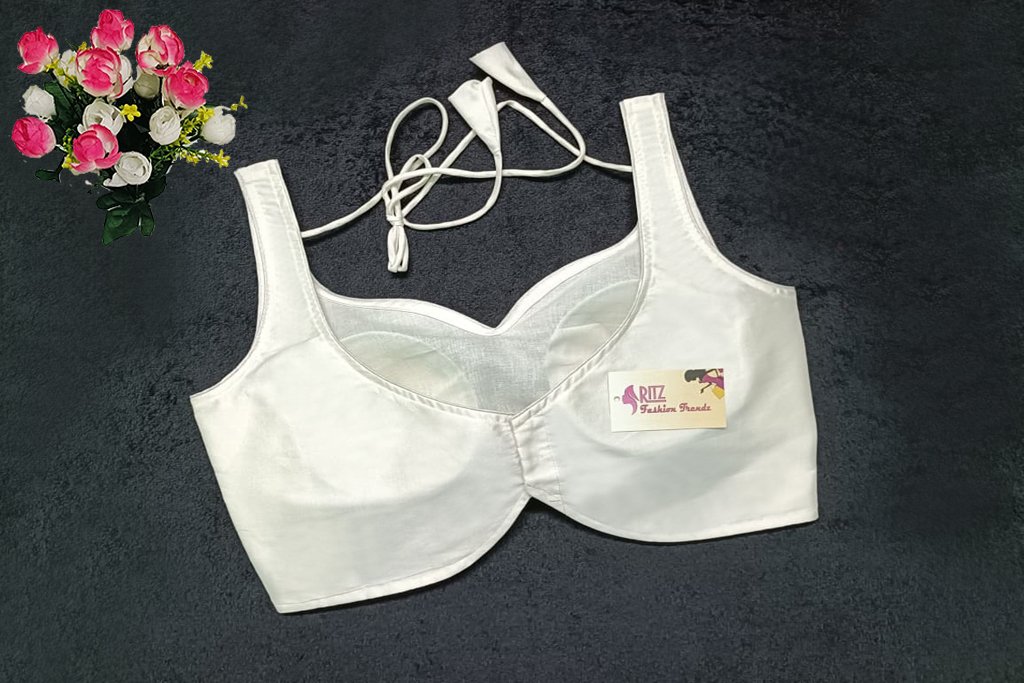This is a White Color Samo Silk Blouse. This is Sweetheart Neckline in Frontside & Leaf Neckline in Backside with Tie-Up. This is a Princess Cut, Padded, Sleeveless Blouse with Back Open. You can team it up with any contrast-colored Traditional/Printed Saree.